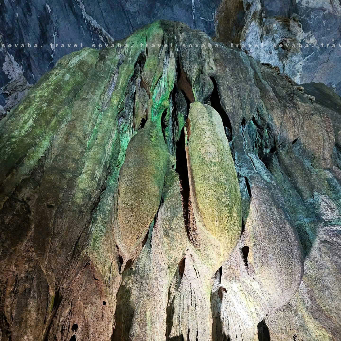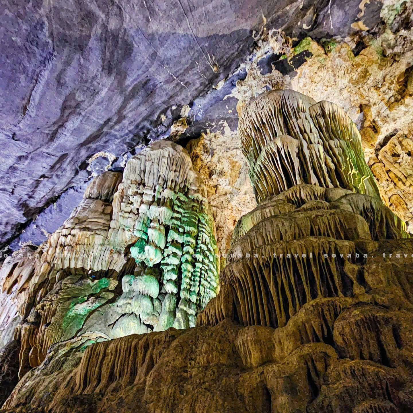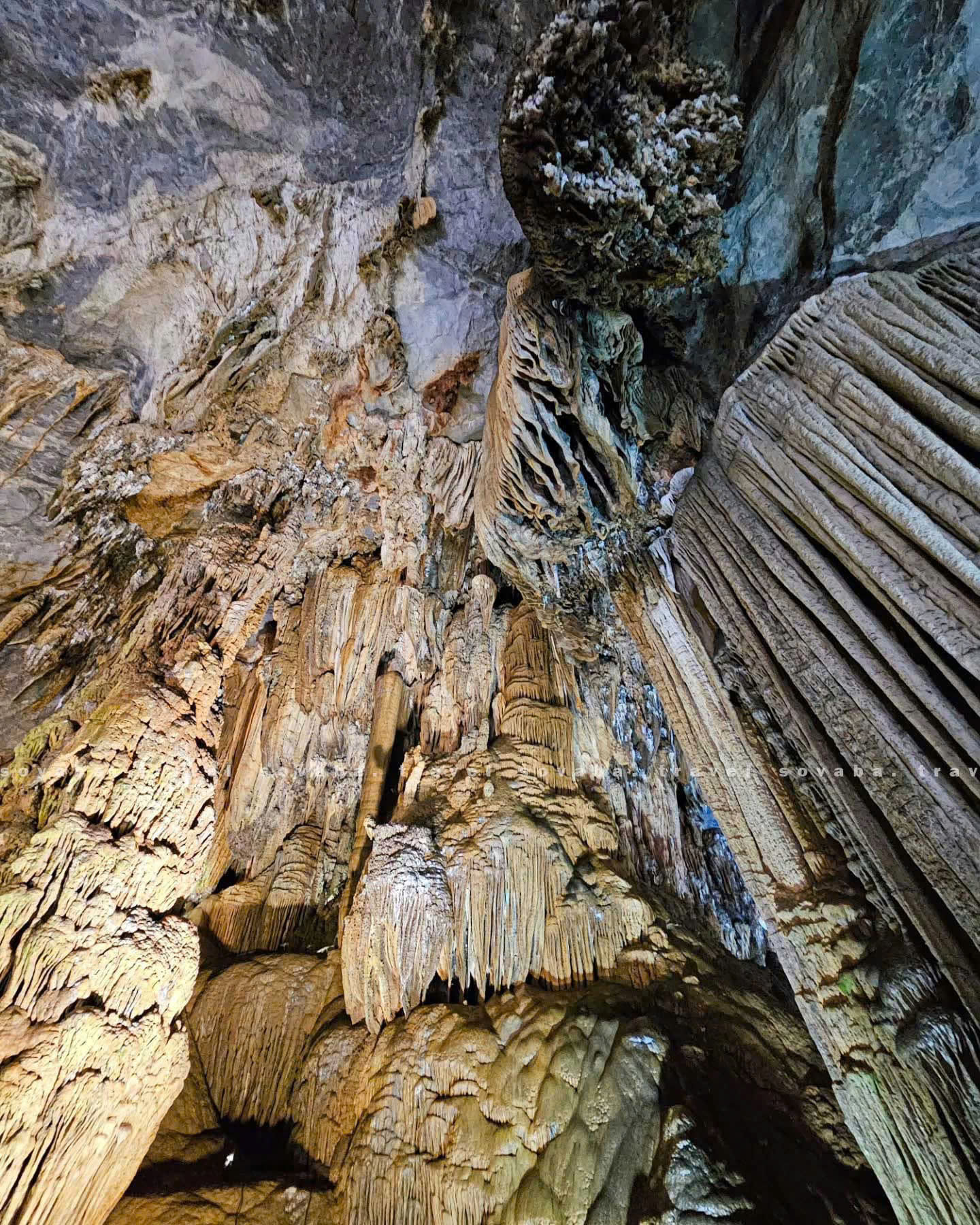 • Stepping inside, visitors will be overwhelmed by the shimmering beauty of the stalactite system illuminated under flashlight. Stone curtains, stalagmites, and stalactites shine like diamonds, creating unique shapes. The deeper you go, the more you will be amazed by the shoals, underground lakes and sparkling rocks, all creating a scene like a fairy tale world.