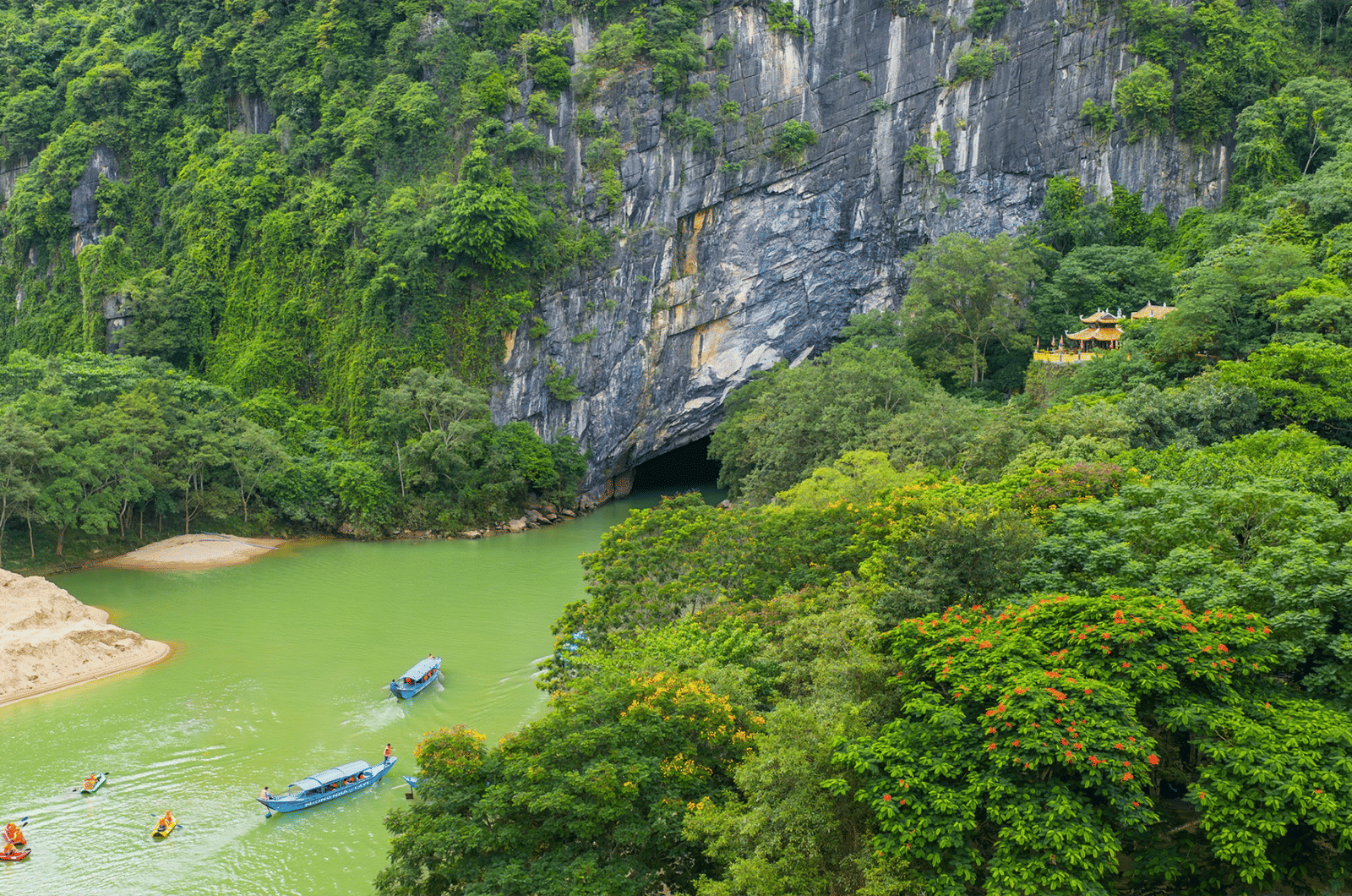 Explore Phong Nha Cave's unique limestone system and caves. Scenic boat ride on the Son River with views of Tram Me village. Hike 1.6 km through rainforest and climb 500 steps to Paradise Cave. Discover stunning stalactites in Asia's longest dry cave.